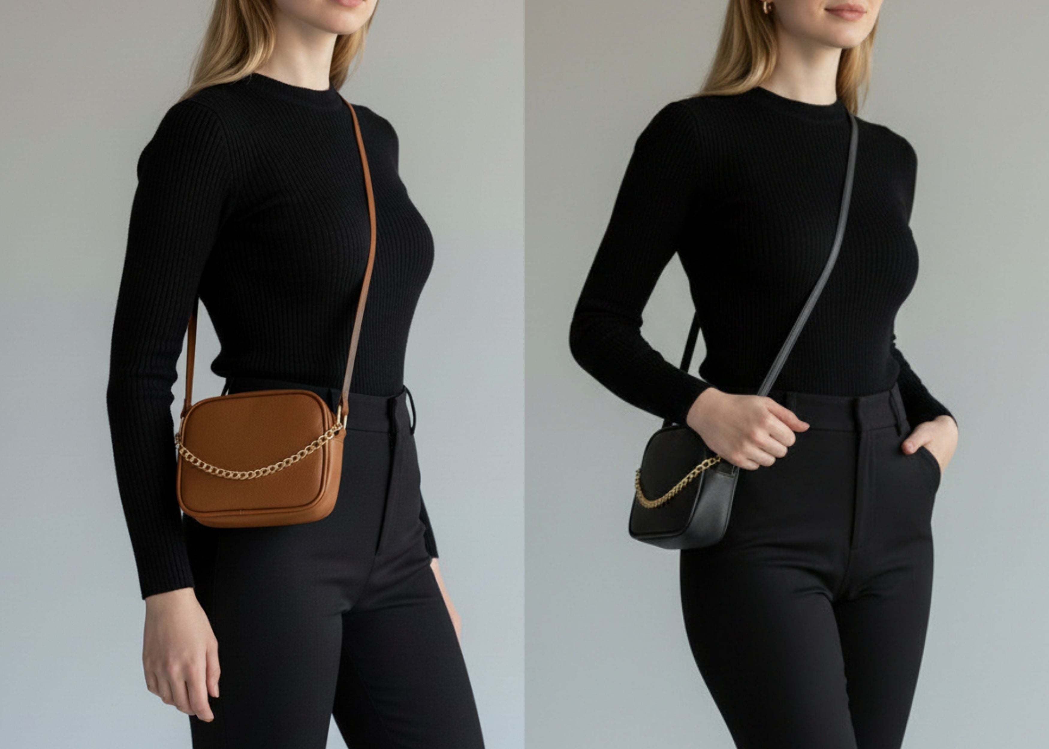 Su silueta compacta, los relieves texturizados y la correa ajustable reflejan un diseño pensado: funcional, elegante y atemporal.
