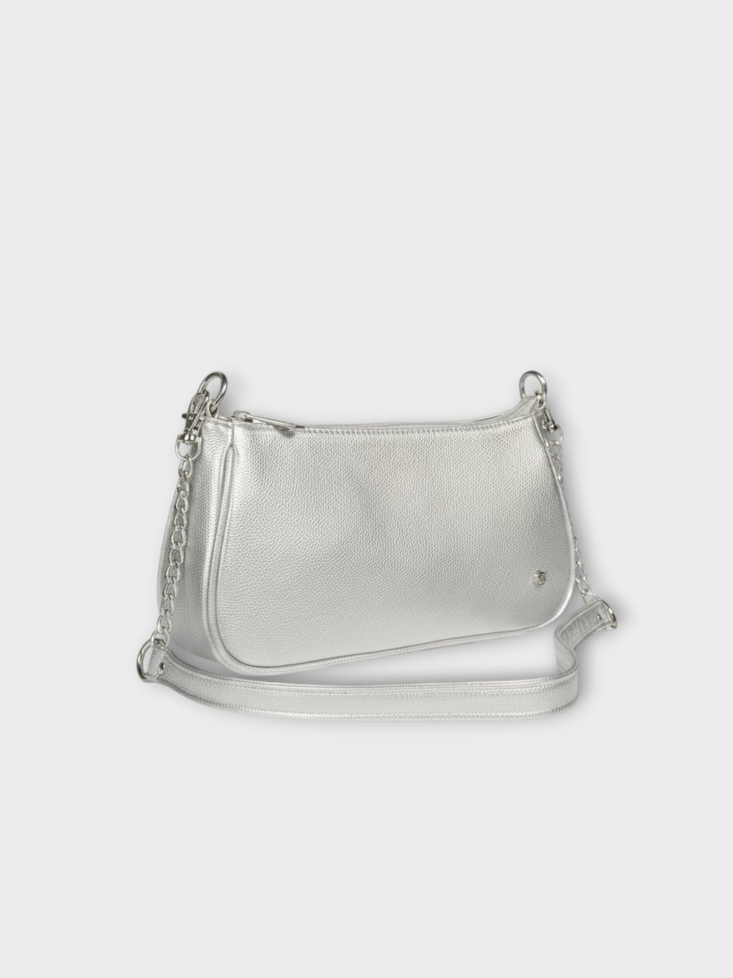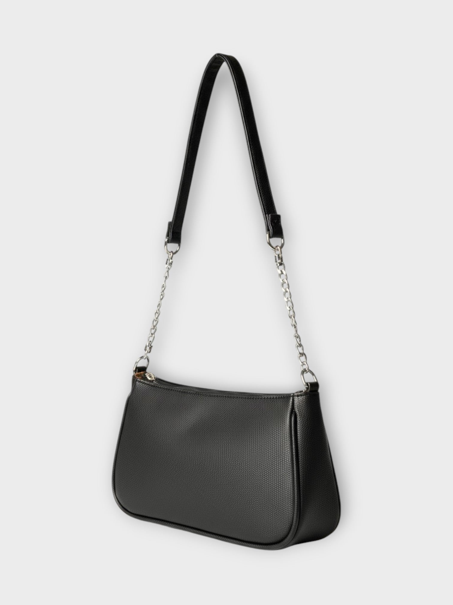 El bolso Romy es un diseño básico y moderno, ideal para el día a día. Fabricado en material sintético de textura suave, combina elegancia y practicidad en un formato compacto. Cuenta con correa al hombro con detalle de cadena metálica y cierre superior con cremallera. Su tamaño mediano permite llevar lo esencial con estilo.