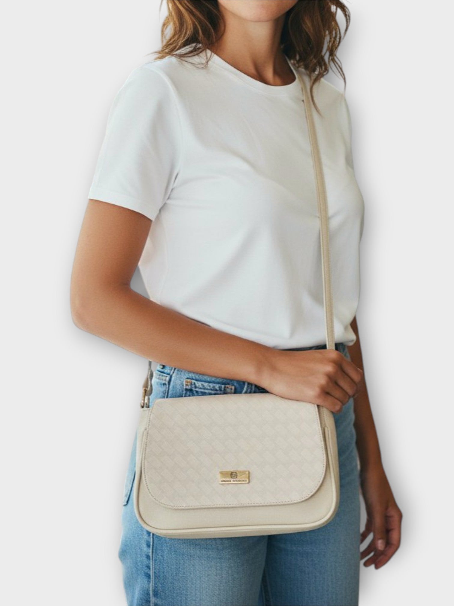 Bolso manos libres (22 cm largo × 18 cm alto × 8 cm ancho) – práctico, con correa ajustable para llevarlo cruzado o al hombro.